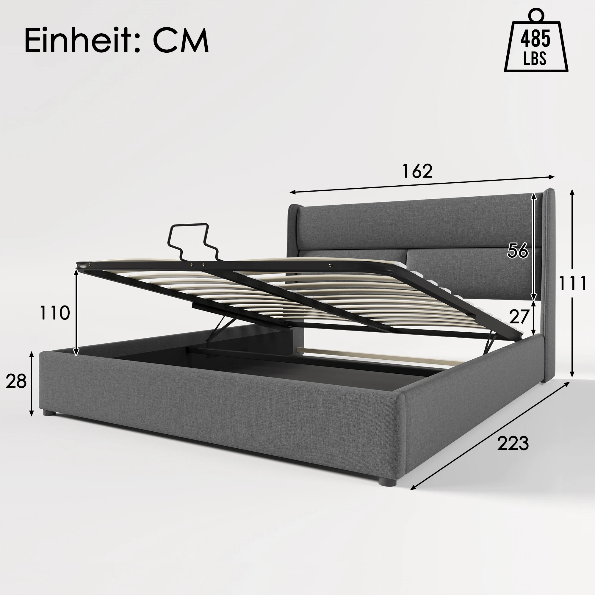 Hydraulisches Doppel polster bett 140x200cm, verstellbares Kopfteil, moderner Bett rahmen mit Stauraum, grau (ohne Matratze)
