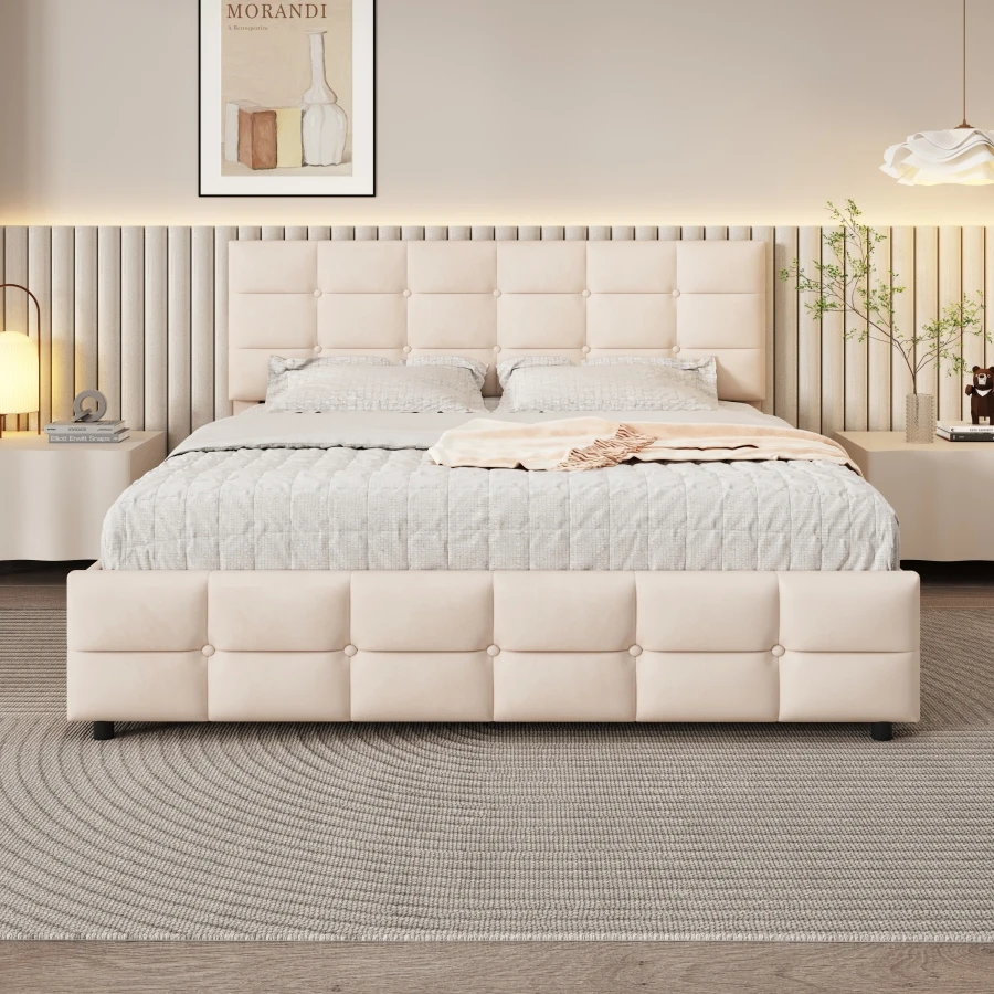 Polster bett 140×200 cm Bett mit Lattenrost, Rückenlehne und großer Schublade, haut freundlicher Flanell stoff, beige, Doppelbett