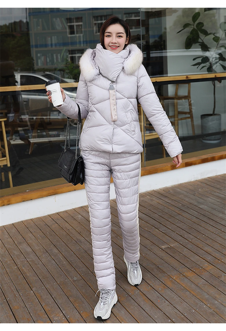 Frauen Winter Wandern Jacke Hosen Anzug Mode Großen revers Pelz Kragen Warme Zwei stück Set Dünne Oberbekleidung Hosen Mantel Unten baumwolle