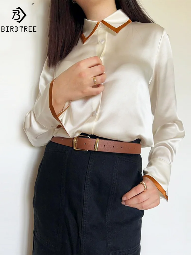 Birdtree 100% Maul beers eide elegante Mode hemden Bogen Schnürung Langarm einfarbig lose Blusen Frühling Herbst Tops