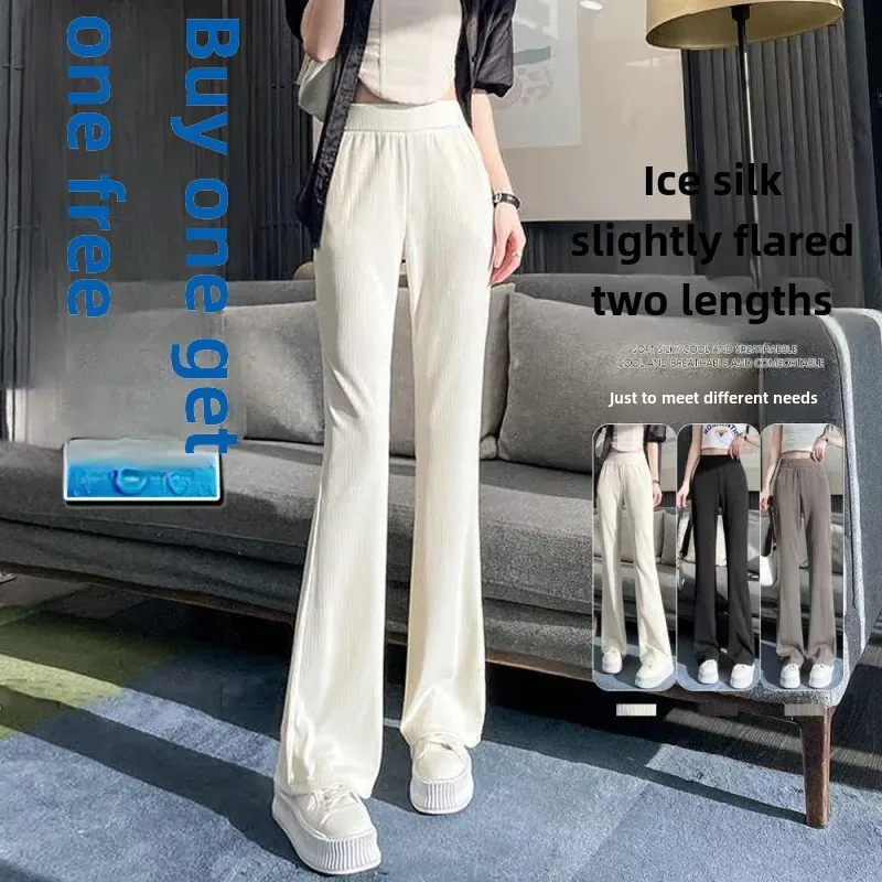 Damen-Hose aus Eisseide mit hoher Taille, drapiert, lässig, lockere Passform, Bootcut, schmale Passform, Sommer, dünner Stil, Einzel-/Doppelpackung