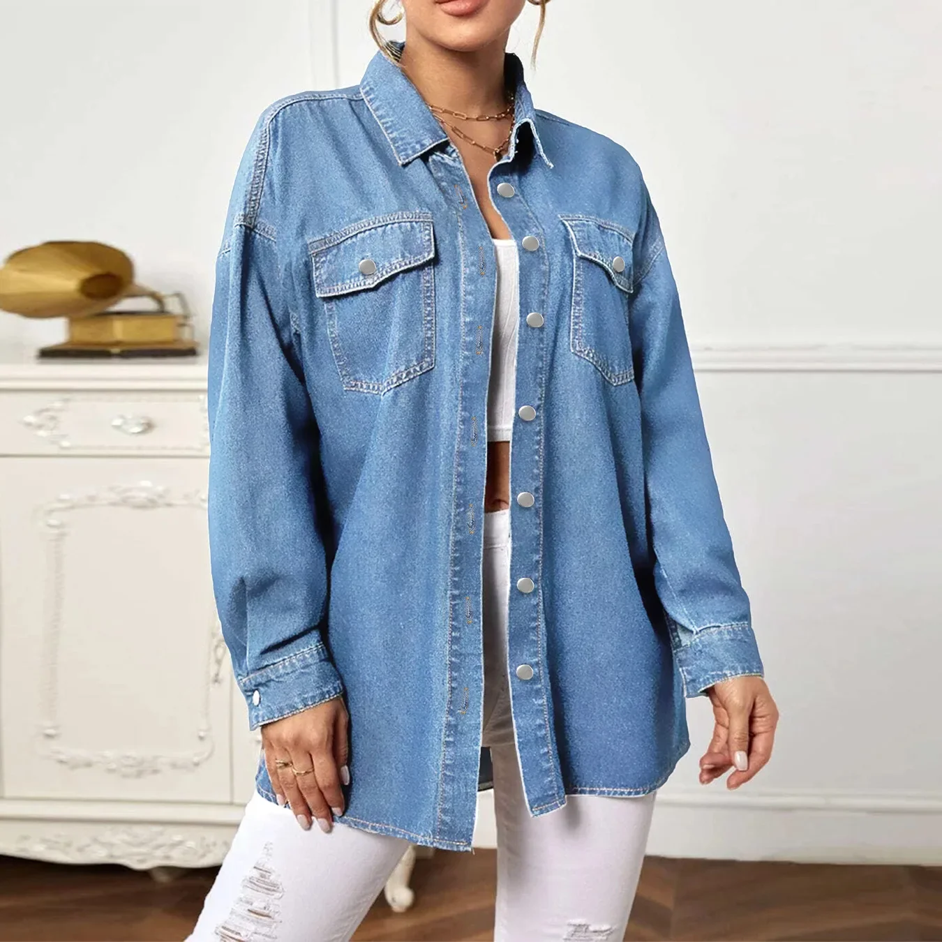 Startseite » Shop » Neues Furred Edge Washed Fringe Denim Tpo Freizeithemd, Damen Herbst Einfarbig Lose Patchwork Denim Hemdjacke mit Taschen